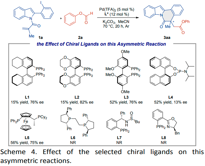 另一方面,钯催化的羰基化策略已被证明是合成羰基化合物的一种强有力的方法。由于一氧化碳(CO)的毒性,已经开发了许多CO替代物,如TFBen、 Mo(CO)6、甲酸酯、和甲酸。沿着这一思路,使用甲酸酯作为羰基来源的钯催化级联羰基化取得了相当大的进展。例如,Zhang课题组开发了一种以甲酸芳基酯为羰基源的Pd催化的对映选择性分子内羰基化Heck反应,得到了一系列产率高、对映选择性高的3,4-二氢异喹啉季铵盐(Scheme 1a)(Chem. Sci. 2019, 10, 9853-9858)。随后,Wu课题组报道了氨基吡啶与酯组装官能化氮杂吲哚衍生物的Pd催化级联Heck环化/羰基化反应(Scheme 1a)(Chem. Commun. 2022, 58, 6825-6828)。2021年,Xu团队实现了含环丁酮的芳基碘化物与甲酸芳基酯的Pd催化羰基化C-C键活化,提供一系列带有酯基的茚酮(Scheme 1b)(Org. Chem. Front. 2021, 8, 3398-3403)。鉴于吲哚并[2,1-a]异喹啉及酯类衍生物的重要药理学特征,将有价值的酯基掺入吲哚并[2,1-a]异喹啉部分将是非常理想的,并可能为发现新的具有生物活性的潜在药物提供机会。随着作者对合成含氮杂环的持续兴趣(Chem. Commun. 2012, 48, 8012-8014),基于此,内蒙古大学陈树峰、王乐明团队报告了使用甲酸芳基酯作为CO源的吲哚Pd催化级联分子内Heck环化/羰基化反应,以提供一系列酯取代的吲哚并[2,1-a]异喹啉(Scheme 1c)。此外,通过使用手性膦配体也实现了不对称版本,从而以良好的产率和对映选择性得到吲哚并[2,1-a]异喹啉产物。