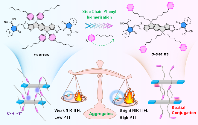 近红外二区(1000-1700 nm)有机光诊疗剂具有较低的自发荧光干扰,可以大大提升荧光成像的组织穿透深度和分辨率,在生物医学领域具有广阔的应用前景。由于这类光诊疗剂绝大部分为疏水性分子,因此通常需要将其包覆成纳米粒子进行使用,这就使得它们的光物理性质不仅取决于分子结构本身,还与分子的聚集行为密切相关。然而,由于分子聚集行为的多样性、敏感性和复杂性,通过精确的分子结构改造来调控分子的聚集行为,进而获得具有理想光物理性能的近红外二区有机光诊疗剂仍具有极大的挑战。通常,改变侧链的长度、位置和支化程度可以改变分子的扭转程度来实现光诊疗剂性能的调控。然而,利用侧链芳基位置来控制侧链与共轭主链间的相互作用强度,进而改变光诊疗剂的聚集行为和调控光诊疗性能的策略在很大程度上却未被探索。