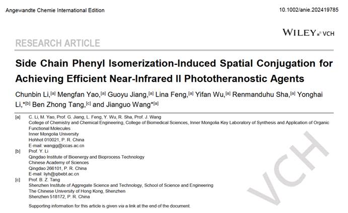 近日,我校化学化工学院王建国教授团队联合中国科学院青岛生物能源与过程研究所李永海副研究员在国际顶级期刊Angewandte Chemie International Edition (Angew. Chem. Int. Ed. 2024. https://doi.org/10.1002/anie.202419785) 上发表题为“Side Chain Phenyl Isomerization-Induced Spatial Conjugation for Achieving Efficient Near-Infrared II Phototheranostic Agents”的重要研究成果。该团队首次提出了一种侧链苯基异构化诱导空间共轭策略,构建了兼具高荧光亮度和优异光热性能的近红外二区有机光诊疗聚集体并将其成功地应用于成像引导的肿瘤光热治疗。我校化学化工学院博士研究生李纯斌(现为香港科技大学博士后)为论文的第一作者,王建国教授和中国科学院青岛生物能源与过程研究所李永海副研究员为通讯作者,内蒙古大学为本论文的第一完成单位。