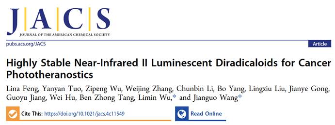 >> 武利民教授和王建国教授联合团队关于高稳定近红外II区有机双自由基光诊疗试剂构筑及抗癌研究成果在国际化学顶级期刊《Journal of the American Chemical Society》发表