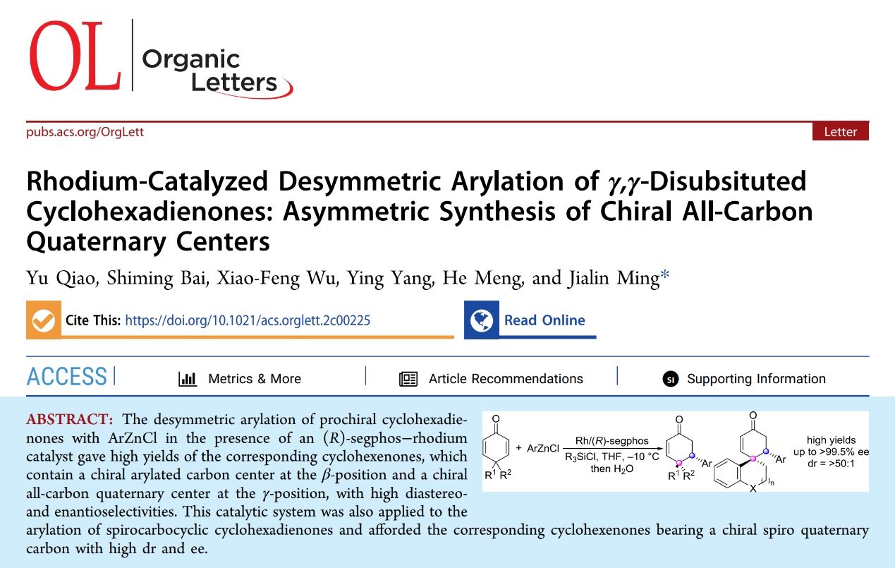 近日,我校化学化工学院明佳林研究员课题组在国际知名学术期刊《Organic Letters》发表了学术论文“Rhodium-Catalyzed Desymmetric Arylation ofγ,γ-Disubsituted Cyclohexadienones: Asymmetric Synthesis of Chiral All-Carbon Quaternary Centers” (https://pubs.acs.org/doi/10.1021/acs.orglett.2c00225),论文第一作者为本校博士研究生乔羽,第一单位为内蒙古大学,通讯作者为明佳林研究员。